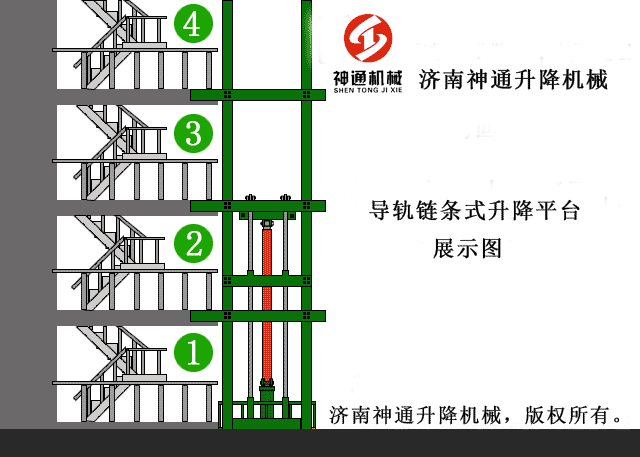 導軌鏈條式升降貨(huò)梯是一種非剪叉式液壓升(shēng)降平台,用於二層以上工業廠房、餐廳、酒樓貨物運輸,由於最低高度僅150-300mm,最實用於不能開挖地坑的工作場所,同時無須(xū)上部調點,具有多種形式(單跨、雙跨(kuà)),動(dòng)作平穩、操作簡單可靠,液壓、電器多種貨物傳輸經濟、輕鬆。(具體承載力及升高層數、尺寸可(kě)根據用戶要求設(shè)計製作)!