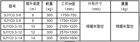 產(chǎn)品規格:車載式液壓升降平台根據升降高度可分為:6、8、10、12、14米升降平台,設備載(zǎi)重300公斤至500公斤。客戶可根據需求選用解放、東風、輕騎、福田、電瓶車等任何車型,設備直接采用汽車或電瓶的直接動力升(shēng)降。