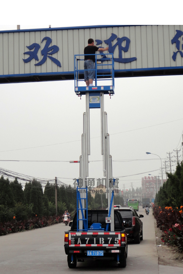 產品規格:車載鋁合金式升降平台根據升(shēng)降高度可分為:單柱6、8、10米,雙柱6、8、10、12米升(shēng)降平台,設備載重150公斤至200公斤(jīn)。客戶可根據需求選用解放、東風、輕騎、福田(tián)、電瓶車等任(rèn)何車(chē)型(xíng),設備直接采用汽車或電瓶(píng)的直接動力升降。